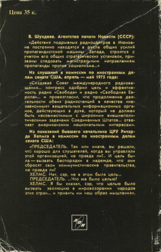 ИЗ ИЗДАНИЯ: Сборник разоблачает диверсионную деятельность радиостанций «Свобода»/«Свободная Европа» (РС/РСЕ), финансируемых Соединенными Штатами Америки и ведущих передачи с территории ФРГ. В основу первой части сборника легли материалы конференции «круглого стола», состоявшейся в г. Заборове (близ Варшавы) в 1978 году, в которой приняли участие руководители агентств печати и журналисты, научные работники - социологи, историки, юристы из Болгарии, Венгрии, ГДР, Польши, СССР и ЧССР. В этой части дана классовая и политическая оценка деятельности РС/РСЕ. Во второй части сборника рассказывается об истории РС/РСЕ, их организационной структуре и связях с ЦРУ, руководящем и «творческом» персонале подрывных радиостанций, о целях и методах антикоммунистической и антисоветской пропаганды, подрывной деятельности против мира и разрядки. Материалы этой части иллюстрируются официальными и секретными документами, фактами из американских, западноевропейских и натовских источников. Многие из этих материалов ранее не публиковались в советских и зарубежных изданиях. |