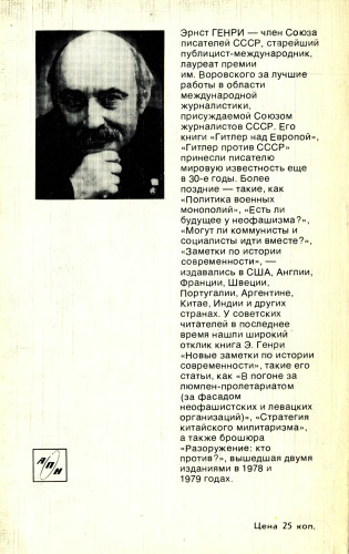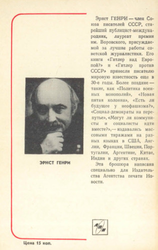 ИЗ ИЗДАНИЯ: Эрнст Генри - член Союза писателей СССР, старейший публицист-международник, лауреат премии им. Воровского, присуждаемой за лучшие работы советской журналистики. Его книги «Гитлер над Европой?» и «Гитлер против СССР» принесли писателю мировую известность еще в 30-е годы. Более поздние - такие, как «Политика военных монополий», «Новая пятая колонна», «Есть ли будущее у неофашизма?», «Социал-демократы на перепутье», «Могут ли коммунисты и социалисты идти вместе?», - издавались массовыми тиражами на разных языках в США, Англии, Франции, Швеции, Португалии, Аргентине, Китае, Индии и других странах. Эта брошюра написана специально для Издательства Агентства печати Новости. Брошюра издана также на английском, французском, испанском, немецком, шведском, итальянском и сербскохорватском языках. |