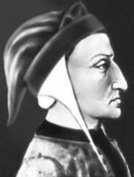 Большая советская энциклопедия: Данте Алигьери (Dante Alighieri) (май 1265, Флоренция, - 14.9.1321, Равенна), итальянский поэт. Происходил из старинного дворянского рода. В наиболее известных юношеских стихах Д., испытавший влияние прованс. трубадуров, сицилийских поэтов и школы «дольче стиль нуово», воспевал молодую женщину по имени Беатриче и оплакивал ее смерть (1290). Эти стихи и присоединенное к ним прозаическое повествование на итальянском языке составили первую в западноевропейской литературе романизированную автобиографию «Новая жизнь» (1292), где мистическое преображение действительности сочетается с глубоким психологическим проникновением в живое чувство. Д. активно участвовал в общественной жизни Флоренции, примкнув к партии «белых» гвельфов (в основном представлявших торгово-ремесленные круги). После победы «черных» гвельфов (партии городского дворянства) Д. был заочно приговорен к сожжению с конфискацией имущества (1302). Позже отошел от «белых» и стал, по его выражению, «сам себе партией». Начались скитания поэта по Италии. Он был приговорен к смерти вторично в 1315 (этот приговор был отменен в 1966!). Последние 6 лет жизни Д. провел в Равенне. К 1304-07 относятся трактаты Д. «О народной речи» на латинском языке и «Пир», включающий три канцоны, созданные раньше, и являющийся первым образцом философской прозы на народном итальянском языке. Изложение вопросов морали, богословия, учения о свойствах души и интеллекта нарушается лирическим элементом - страстными тирадами, не свойственными этому жанру. В трактате «О народной речи» Д. говорит о родстве романских языков и об итальянских диалектах. Междоусобная борьба во Флоренции и войны между итальянскими городами, интриги папской курии, падение морального авторитета церкви, личный опыт изгнанника, которому пришлось странствовать почти по всей стране, осознание единства итальянского нации - все это привело к тому, что Д. возложил надежды на германского императора Генриха VII, вошедшего в 1310 со своим войском в Италию. Д. видел в Генрихе миротворца, наследника Римской империи, которому предназначено возродить Италию. В поддержку Генриха поэт написал на латинском языке 3 послания (1310-11). В политическом трактате «О монархии» (1312-13) на латинском языке. Д. защищает идеал всемирной монархии как государства, которое должно обеспечить земное благополучие людей. Вершина творчества Д. - поэма «Комедия», названная потомками «Божественной» (по-видимому, начата в 1307, закончена в 1321, первое печатное издание 1472). форма поэмы восходит к традиционному жанру «видения»; она изображает странствие поэта по загробному миру и состоит из трех частей: «Ад», «Чистилище» и «Рай». Руководимый Вергилием (символ земного разума) герой поэмы, сам Д., воплощающий греховное человечество, спускается в ад (мир осуждения) - подземную воронку, разделенную на 9 кругов, затем поднимается на гору чистилища (мир искупления), очищается от грехов и в сопровождении Беатриче (символ божественного разума) возносится в рай (мир блаженства и познания абсолютной истины). В последних песнях «Рая» Беатриче сменяет третий вожатый Д. - Бернар Клервоский, богослов-мистик 13 в. В «Комедии» отчетливо проявляется переходный характер творчества Д. Со средневековьем ее связывает аллегорическая картина неподвижного загробного мира, подчиненная представления