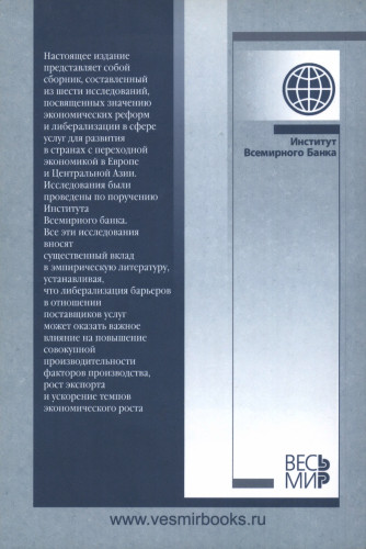 ИЗ ИЗДАНИЯ: Настоящее издание представляет собой сборник, составленный из шести исследований, посвященных значению экономических реформ и либерализации в сфере услуг для развития в странах с переходной экономикой в Европе и Центральной Азии. Исследования были проведены по поручению Института Всемирного банка. Все эти исследования вносят существенный вклад в эмпирическую литературу, устанавливая, что либерализация барьеров в отношении поставщиков услуг может оказать важное влияние на повышение совокупной производительности факторов производства, рост экспорта и ускорение темпов экономического роста. |